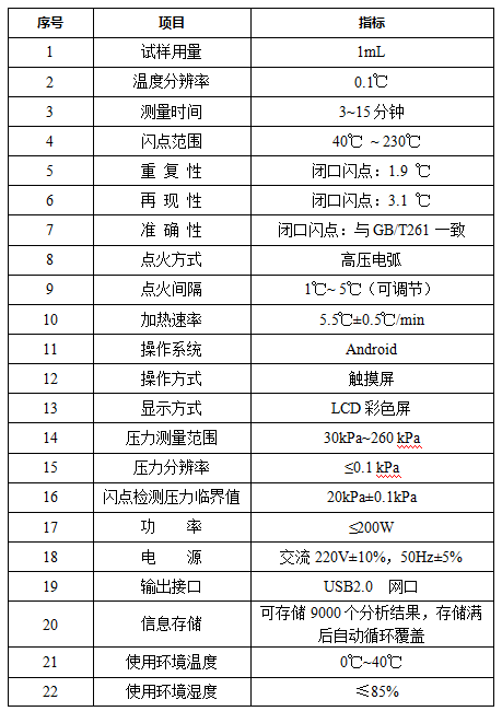 閃點測試儀符合ASTM D6450、SH/T 0768和DL/T 1354標準方法要求。儀器采用了全新的檢測方法,能夠用于基地實驗室和機動化驗裝備,檢測燃料和潤滑油的閃點(閉口)。體積小,重量輕,用樣量少(1ml試樣)、測試速度快、操作簡便、自動測定、環保(密閉無污染)、準確、重復性好等特點。采用了LCD電容觸摸顯示屏,安卓操作系統,簡體中文顯示,改善了人機交互、讀取使用說明書等計算機功能,測量結果自動打印,實現了智能化自動檢測。