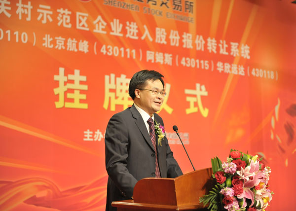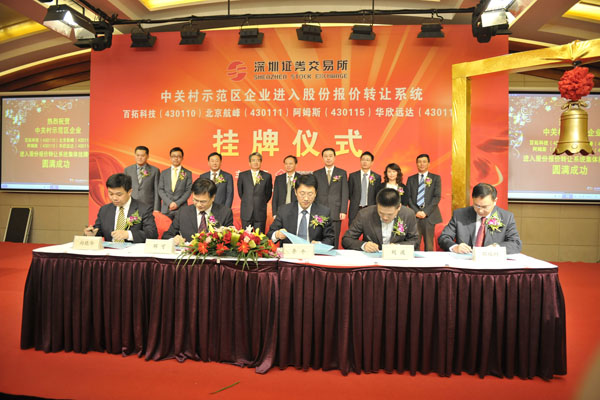 2012年4月10日,北京航峰、百拓科技、阿姆斯和華欣遠(yuǎn)達(dá)四家企業(yè)集體掛牌新三板,至此,中關(guān)村園區(qū)已有118家企業(yè)在新三板市場(chǎng)實(shí)現(xiàn)掛牌。同時(shí),隨著場(chǎng)外市場(chǎng)建設(shè)日益受到國(guó)家有關(guān)部門(mén)和社會(huì)各界的重視與支持,新三板市場(chǎng)正迎來(lái)快速發(fā)展的良好機(jī)遇。