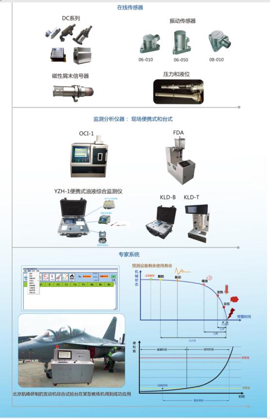 北京航峰自主研發(fā)生產(chǎn)的在線傳感器包括:DC系列滑油在線金屬磨屑監(jiān)測器、磁性屑末傳感器、振動傳感器及壓力和液位計,實時監(jiān)測如發(fā)現(xiàn)有異常超標項,可以由線下分析儀器作進一步測量分析。
