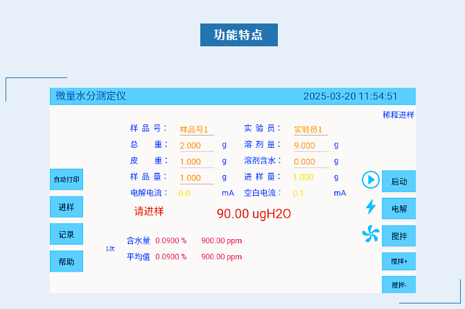 ● 液體(體積)進樣、稱重(質量)進樣、稀釋進樣、氣體(體積)進樣四種方式選擇,每種進樣方式均可顯示實測水分值,并對測試結果自動計算含水量,極大方便了測試工作;